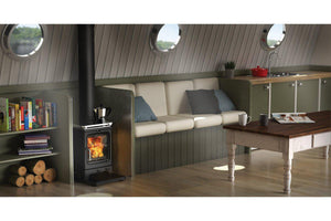 The top or rear fitted flue outlet, with its diameter of just 100mm (4"), also makes the Peanut 3 a great choice for non-domestic off-grid installations such as shepherd's huts, log cabins and yurts with their typically shorter flue heights. This will not only improve the udraught but also help save money on costly flue components. To comply with building regulations for domestic installations, being Defra Approved, the 4" connecting flue pipe needs to be stepped up to any connecting 125mm (5") twin wall or flue liner. The simple design lines, where the focus is definitely on the big window, allows the Peanut 3 to look equally good in either modern or traditional fireplaces.