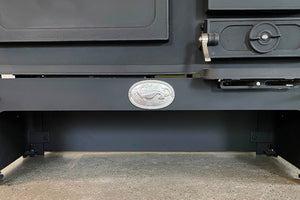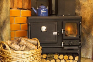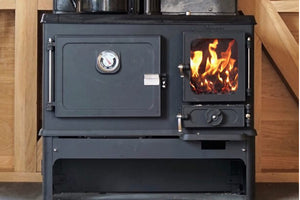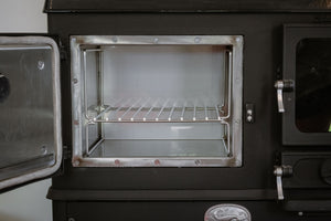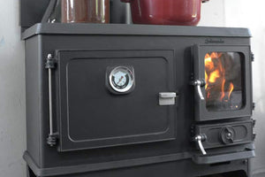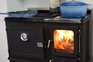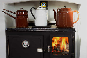 The Little Range delivers all of the abundant heat of the Hobbit with its 4.3kW nominal output and 86.7% A+ efficiency – 83.4% if you need to burn smokeless coal (optional coal bars recommended). On top of this you get a decent sized stainless steel hotplate (667 x 216 mm / 26.7” x 8.6” approx) inset within a chunky wipe-clean enamelled bumper that will hold a kettle and a couple of medium-sized cook pots (or one large rectangular casserole dish) at the same time. The hotplate provides a versatile range of temperatures across its whole surface, for example allowing you to simmer at one end and fry at the other. The hotplate can also be easily removed to allow for deep cleaning when necessary. To widen your cooking options there’s also an oven / plate warmer that will hold a couple of baking trays or one oven-proof pot. The oven has a useful stainless steel trimmed temperature gauge on the cast iron oven door with the temperature controlled via a robust stainless steel intuitive lever dial at the back of the hotplate.