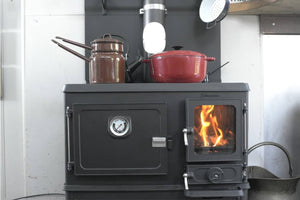 The Little Range’s 100mm (4”) flue pipe size (top outlet only) also ensures that it will create sufficient updraught needed for safe operation in single storey constructions without having to create a large length of unsightly external chimney. You must ensure however that the appropriate spillage tests are carried out and that any overhanging trees and neighbouring buildings will not affect the draught. For the complete off-grid package you can also specify the optional stainless steel 1kW side boiler. This fits inside the right hand side of the Little Range’s firebox to provide a useful supply of indirect hot water for the essentials such as dish washing, when for safety reasons, it is connected to the appropriate hot water tank (not supplied). For small sheds and shepherd huts etc this also has the advantage of reducing excessive heat to the room.
