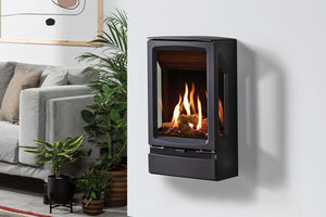 From wherever in the room you look at it the floating Midi T Wall-Mounted contemporary styled gas stove (balanced flue only) is going to look simply stunning with its 180º view of its magnificent log-effect firebed and natural flame picture which make it difficult to distinguish from the real thing. Cast iron top plate and bodywork complete the authentic log burner look.