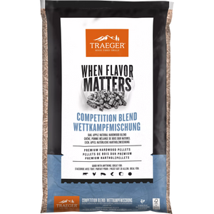 Traeger Competition Blend Hardwood Pellets impart a mild, fruity flavor that goes beautifully with chicken, pork, and veggies.