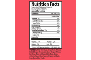 Water, Sugar, Tomato Paste, Molasses, Distilled White vinegar, Worcestershire sauce, salt, cayenne Chilli Powder, garlic granules, crushed chilli, mustard powder, black pepper