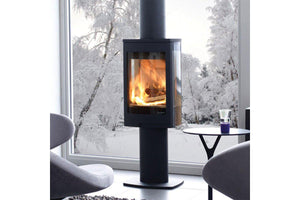 The Nordpeis Duo 1 Wood burner features a large glass door with side viewing glass and a pedestal base.